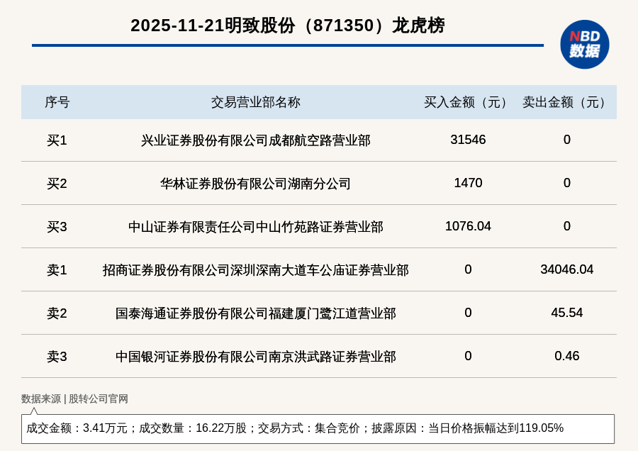 每經(jīng)訊,2025年11月21日,新三板基礎層公司明致股份(871350,收盤價:0.46元)登上龍虎榜,交易方式是集合競價,披露原因是當日價格振幅達到119.05%,成交數(shù)量16.22萬股,成交金額3.41萬元。買一席位為興業(yè)證券股份有限公司成都航空路營業(yè)部,買入3.15萬元;賣一席位為招商證券股份有限公司深圳深南大道車公廟證券營業(yè)部,賣出3.4萬元。
