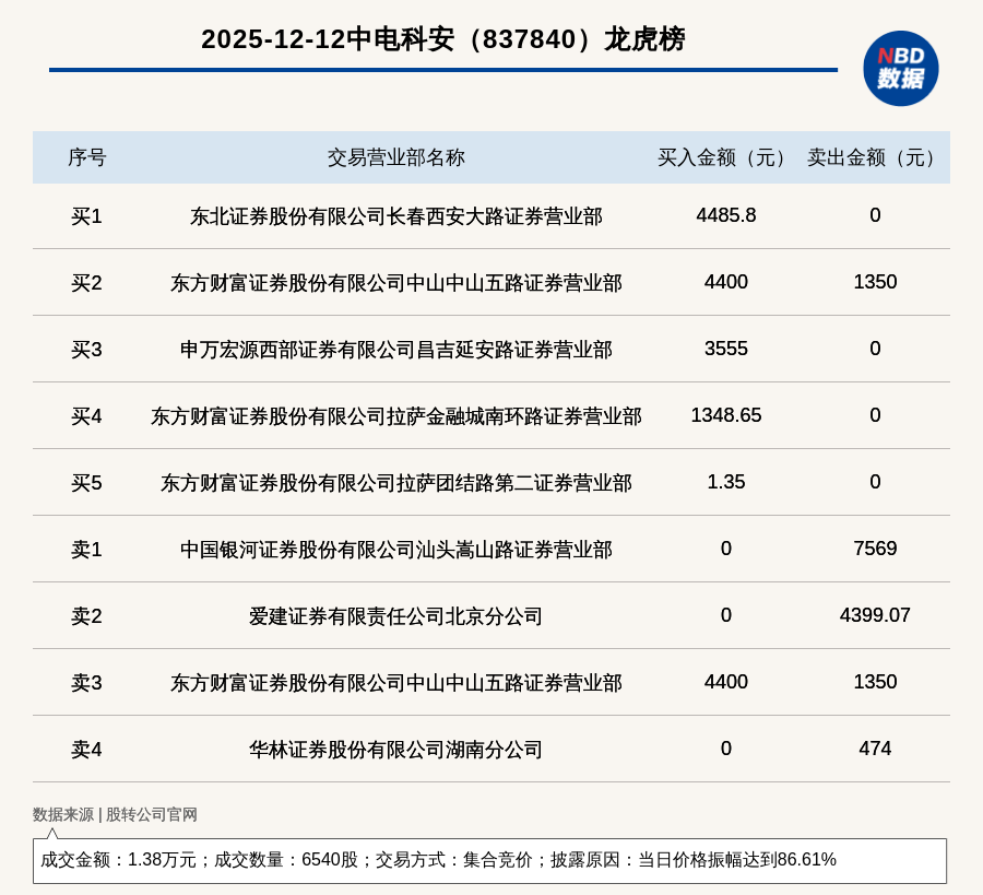 每經訊,2025年12月12日,新三板創新層公司中電科安(837840,收盤價:2.37元)登上龍虎榜,交易方式是集合競價,披露原因是當日價格振幅達到86.61%,成交數量6540股,成交金額1.38萬元。買一席位為東北證券股份有限公司長春西安大路證券營業部,買入4485.8元;賣一席位為中國銀河證券股份有限公司汕頭嵩山路證券營業部,賣出7569元。