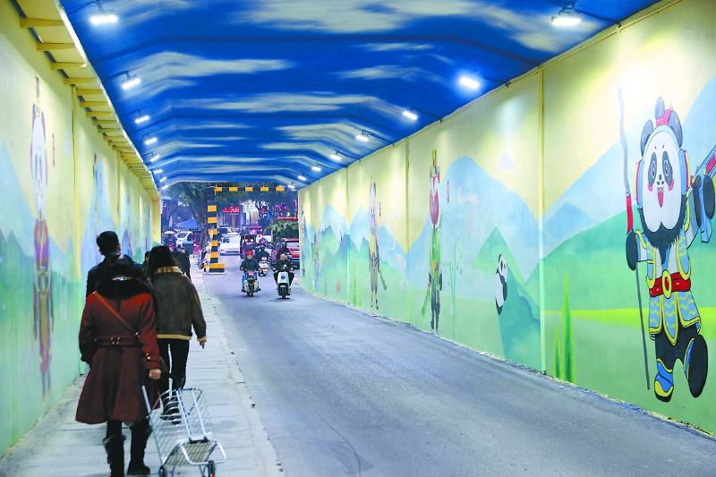 民有所呼,政有所應。作為順慶區城市微更新重點工程,鐵明路及鐵路涵洞于2025年10月15日啟動封閉改造,先由區住建局完成雨污分流埋管,再由區綜合行政執法局市政所無縫銜接路面翻新與墻體美化,12月1日便正式恢復通行,僅用1個半月實現“痛點”變“亮點”。如今走進涵洞,破損路面已換成平整瀝青路面,新增的排水系統徹底解決積水難題,單向增設的高亮度LED燈,讓通行安全系數大幅提升。更令人眼前一亮的是墻體彩繪:西側通道里,熊貓版諸葛亮手持羽扇、張飛揮舞丈八蛇矛,將三國文化與熊貓元素巧妙融合;東側通道則繪上清暉閣、絲綢女神、萬卷樓等南充地標。整個涵洞頂部鋪滿“藍天白云”,仿佛將戶外晴空“搬”進通道。