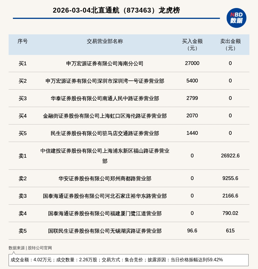 每經訊,2026年3月4日,新三板創新層公司北直通航(873463,收盤價:1.99元)登上龍虎榜,交易方式是集合競價,披露原因是當日價格振幅達到59.42%,成交數量2.26萬股,成交金額4.02萬元。買一席位為申萬宏源證券有限公司海南分公司,買入2.7萬元;賣一席位為中信建投證券股份有限公司上海浦東新區福山路證券營業部,賣出2.69萬元。