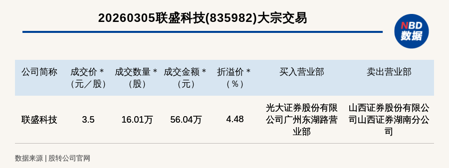 每經訊,2026年3月5日,新三板基礎層公司聯盛科技(835982,收盤價:3.35元)發生一筆大宗交易,成交價3.5元/股,成交數量16.01萬股,成交金額56.04萬元,溢價4.48%。買入營業部是光大證券股份有限公司廣州東湖路營業部,賣出營業部是山西證券股份有限公司山西證券湖南分公司。