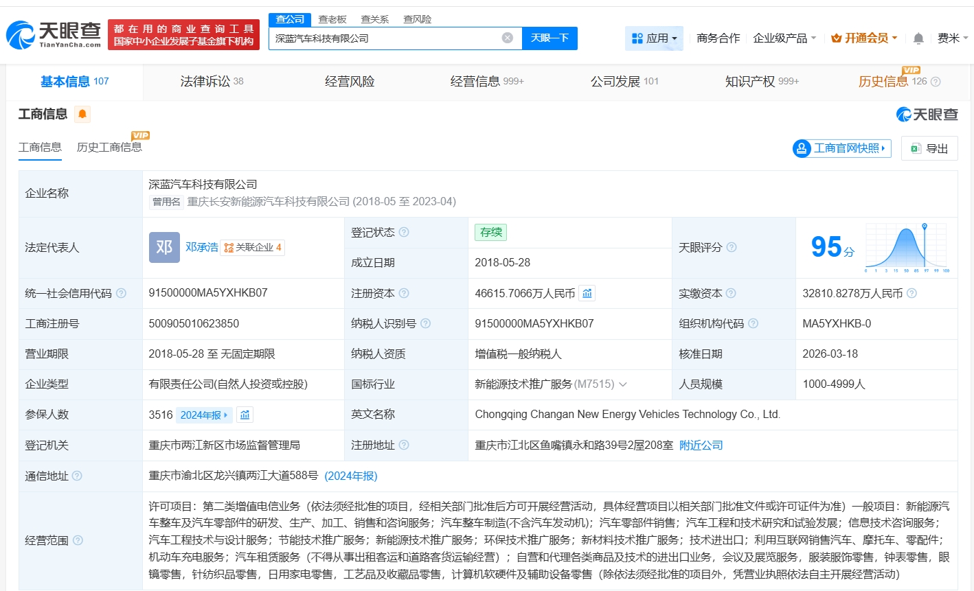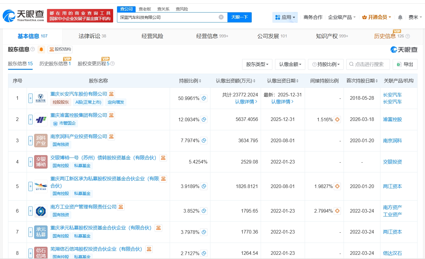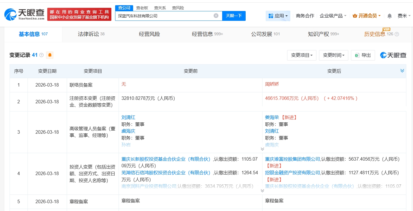 每經(jīng)AI快訊,天眼查工商信息顯示,近日,深藍汽車科技有限公司發(fā)生工商變更,新增重慶渝富控股集團有限公司、招銀金融資產(chǎn)投資有限公司為股東,注冊資本由約3.3億元人民幣增至約4.7億元人民幣,增幅約42%。深藍汽車科技有限公司成立于2018年5月,法定代表人為鄧承浩,經(jīng)營范圍包括新能源汽車整車及汽車零部件的研發(fā)、生產(chǎn)、加工、銷售和咨詢服務(wù)等。股東信息顯示,該公司由長安汽車(000625)、南京潤科產(chǎn)業(yè)投資有限公司及上述新增股東等共同持股。