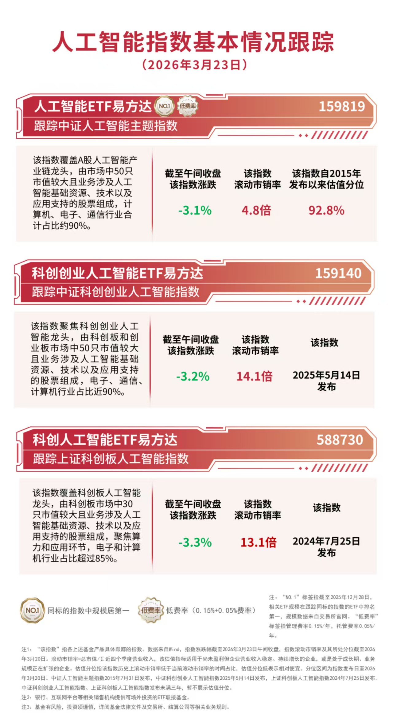 截至午間收盤,中證人工智能主題指數下跌3.1%,中證科創創業人工智能指數下跌3.2%,上證科創板人工智能指數下跌3.3%。資金逆勢布局,人工智能ETF易方達(159819,聯接A/C:012733/012734)半日凈申購達1200萬份。