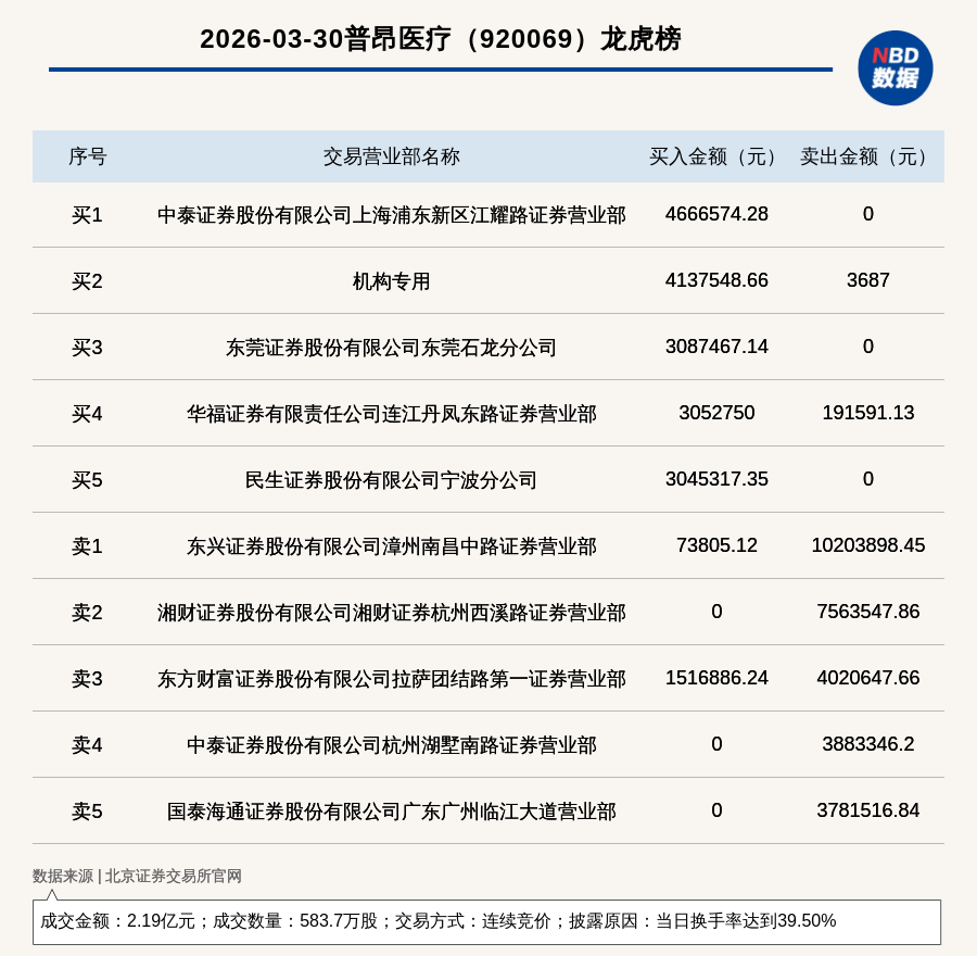 每經訊,2026年3月30日,北交所上市公司普昂醫療(920069,收盤價:36.68元)登上龍虎榜,交易方式是連續競價,披露原因是當日換手率達到39.50%,成交數量583.7萬股,成交金額2.19億元。買一席位為中泰證券股份有限公司上海浦東新區江耀路證券營業部,買入466.66萬元;賣一席位為東興證券股份有限公司漳州南昌中路證券營業部,賣出1020.39萬元。
