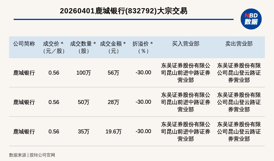 每經(jīng)訊,2026年4月1日,新三板基礎(chǔ)層公司鹿城銀行(832792,收盤價:0.8元)發(fā)生3筆大宗交易,總成交金額為103.6萬元,成交金額最高的一筆成交價0.56元/股,成交數(shù)量100萬股,成交金額56萬元,折價30%。買入營業(yè)部是東吳證券股份有限公司昆山前進(jìn)中路證券營業(yè)部,賣出營業(yè)部是東吳證券股份有限公司昆山登云路證券營業(yè)部。