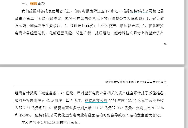 表面的盈利復蘇難掩深層風險。《每日經濟新聞》記者注意到,能特科技2024年財務報告被審計機構出具帶強調事項段的無保留意見。審計報告“強調事項”直指兩大關鍵:一是公司擬出讓非核心主業資產,二是對塑貿電商業務相關資產組計提7.45億元大額商譽減值。