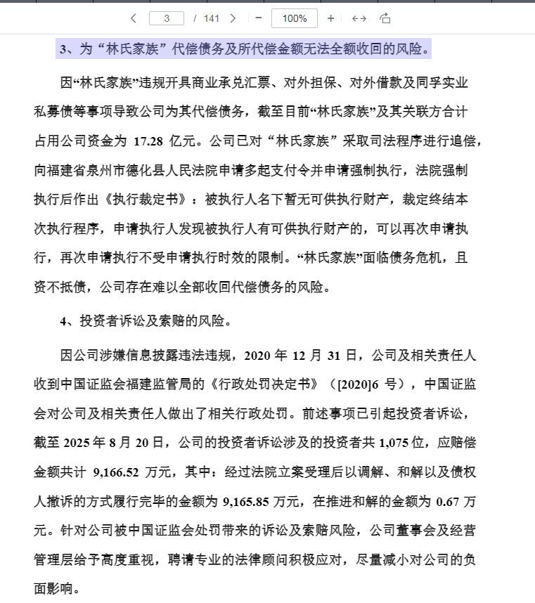 然而,原控股股東“林氏家族”留下的窟窿仍未填平。受林氏家族違規事項拖累,公司曾為其代償債務,截至2025年上半年末,林氏家族及其關聯方合計占用公司資金仍達17.28億元。而“林氏家族”資不抵債,公司存在難以全部收回代償債務的風險。