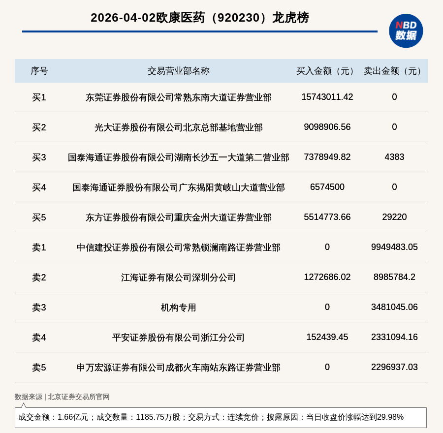 每經(jīng)訊,2026年4月2日,北交所上市公司歐康醫(yī)藥(920230,收盤(pán)價(jià):14.61元)登上龍虎榜,交易方式是連續(xù)競(jìng)價(jià),披露原因是當(dāng)日收盤(pán)價(jià)漲幅達(dá)到29.98%,成交數(shù)量1185.75萬(wàn)股,成交金額1.66億元。買(mǎi)一席位為東莞證券股份有限公司常熟東南大道證券營(yíng)業(yè)部,買(mǎi)入1574.3萬(wàn)元;賣(mài)一席位為中信建投證券股份有限公司常熟鎖瀾南路證券營(yíng)業(yè)部,賣(mài)出994.95萬(wàn)元。