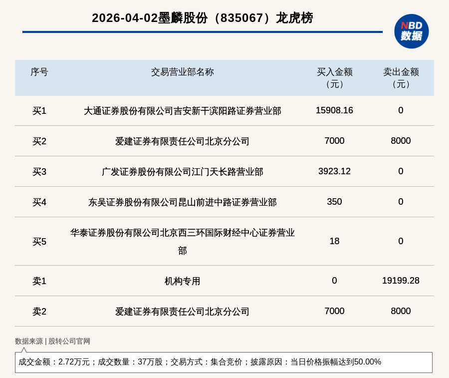 每經訊,2026年4月2日,新三板基礎層公司墨麟股份(835067,收盤價:0.06元)登上龍虎榜,交易方式是集合競價,披露原因是當日價格振幅達到50.00%,成交數量37萬股,成交金額2.72萬元。買一席位為大通證券股份有限公司吉安新干濱陽路證券營業(yè)部,買入1.59萬元;賣一席位為機構專用,賣出1.92萬元。