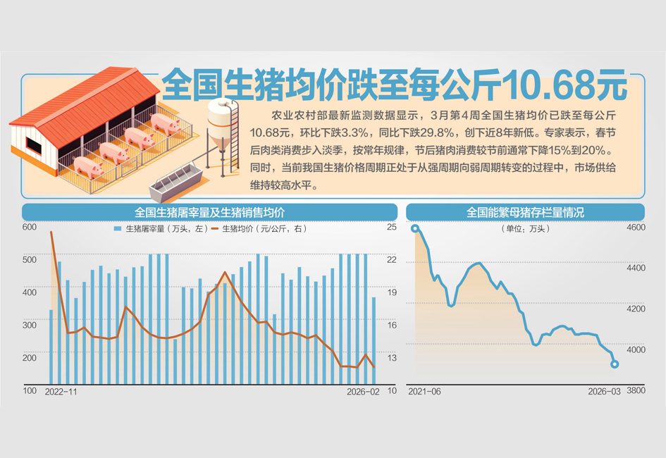 中國農業科學院農業經濟與發展研究所研究員、國家生豬產業技術體系產業經濟崗位科學家王祖力在接受《每日經濟新聞》記者電話采訪時表示,3月份第4周全國生豬平均價格10.68元/公斤,為近8年低點,已連續8周下跌。