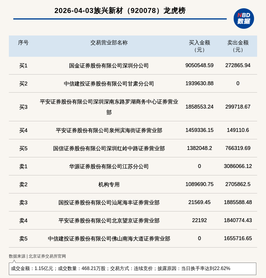 每經(jīng)訊,2026年4月3日,北交所上市公司族興新材(920078,收盤價:24.2元)登上龍虎榜,交易方式是連續(xù)競價,披露原因是當(dāng)日換手率達到22.62%,成交數(shù)量468.21萬股,成交金額1.15億元。買一席位為國金證券股份有限公司深圳分公司,買入905.05萬元;賣一席位為華源證券股份有限公司江蘇分公司,賣出308.61萬元。