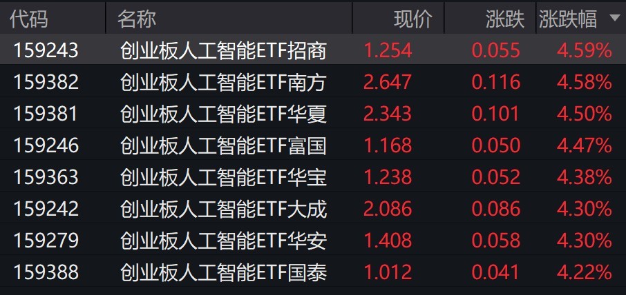 受盤面影響,創(chuàng)業(yè)板人工智能相關(guān)ETF漲超4%。