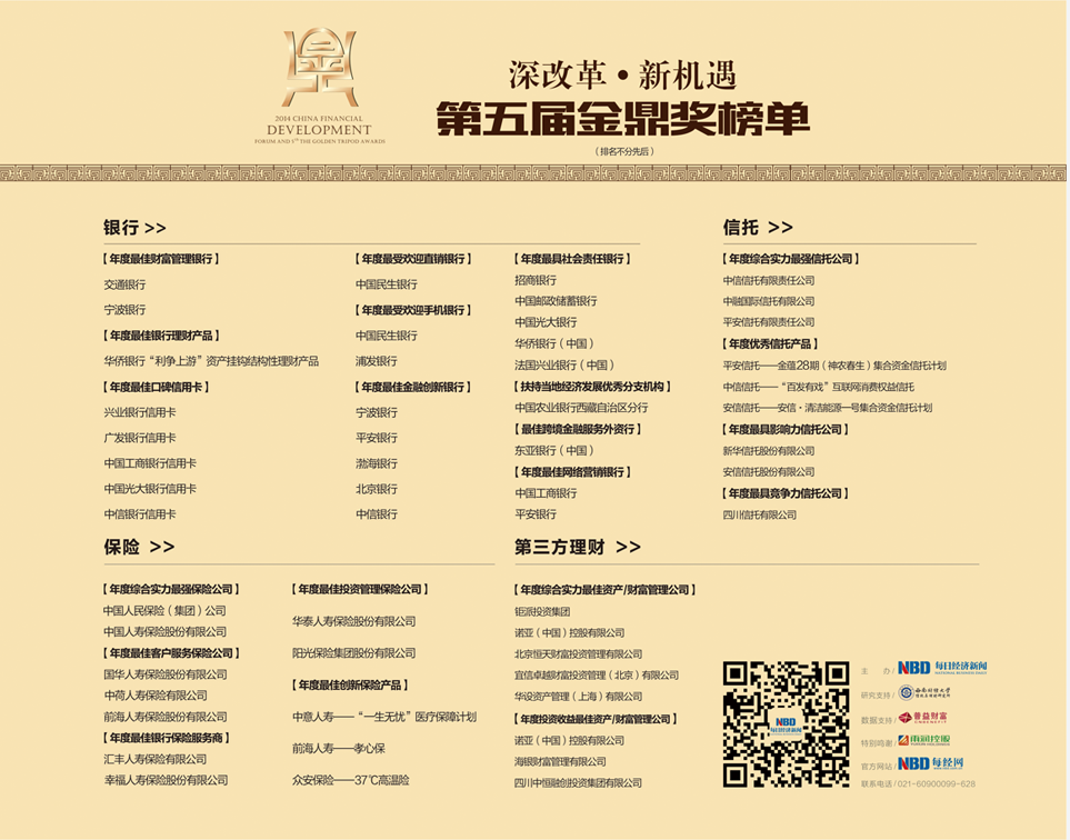 “金鼎獎(jiǎng)” 作為《每日經(jīng)濟(jì)新聞》全力打造的核心品牌活動(dòng)之一,已經(jīng)成功舉辦四屆,其憑借專業(yè)、權(quán)威的評(píng)選標(biāo)準(zhǔn)得到了社會(huì)各界的廣泛 關(guān)注與認(rèn)可,成為冬季中國(guó)金融行業(yè)最受矚目的大事記。今年,《每日經(jīng)濟(jì)新聞》繼續(xù)聯(lián)合權(quán)威學(xué)術(shù)單位,運(yùn)用科學(xué)的模型和研究方法,為 中國(guó)高端投資者提供一份公正、權(quán)威的金融產(chǎn)品、品牌和團(tuán)隊(duì)機(jī)構(gòu)的榜單。