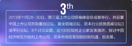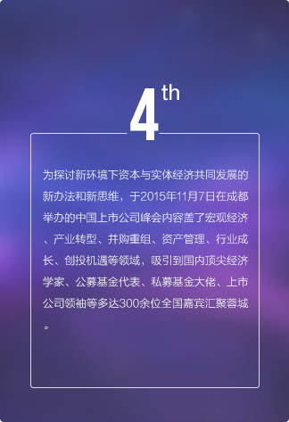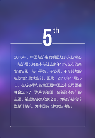 上市公司領袖峰會是由每日經濟新聞主辦的中國資本市場最具影響力的大型交流平臺,最重要的年度盛會之一,峰會自2011年發起,迄今已經連續舉辦五屆。2017年第六屆中國上市公司領袖峰會將以“新時代 新機遇 新擔當”為主題,匯聚中國數百家優秀上市公司、上百家券商基金機構,邀請政府官員、商界領袖、學界專家齊聚成都,共話財經宏圖與資本愿景。