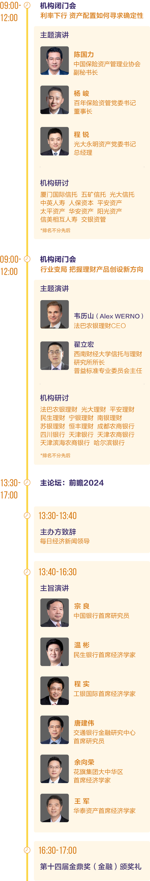 第十四屆中國金融發展論壇暨金鼎獎(金融)頒獎禮將于12月6日在北京隆重舉行。主論壇以“前瞻2024”為主題匯集頂級金融機構的研究成果,就2024宏觀經濟金融形勢進行分享。分論壇聚焦金融機構資產端和產品端兩大細分領域,邀請相關機構業務負責人展開閉門研討。